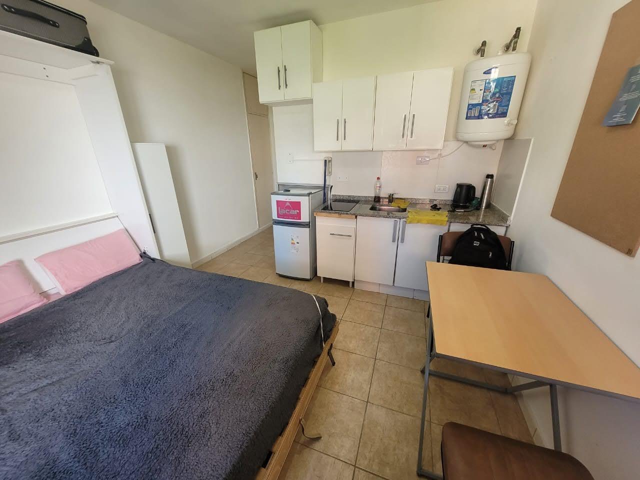 Monoambiente impecable, ideal para estudiantes o primer hogar . Son 15 m² totales, totalmente amueblado y equipado , con práctica cama rebatible tipo “cama pared” que optimiza el espacio. Ambiente súper luminoso , orientado al este, en 3° piso de edificio de 6 niveles . Baño completo